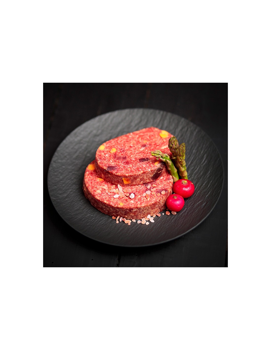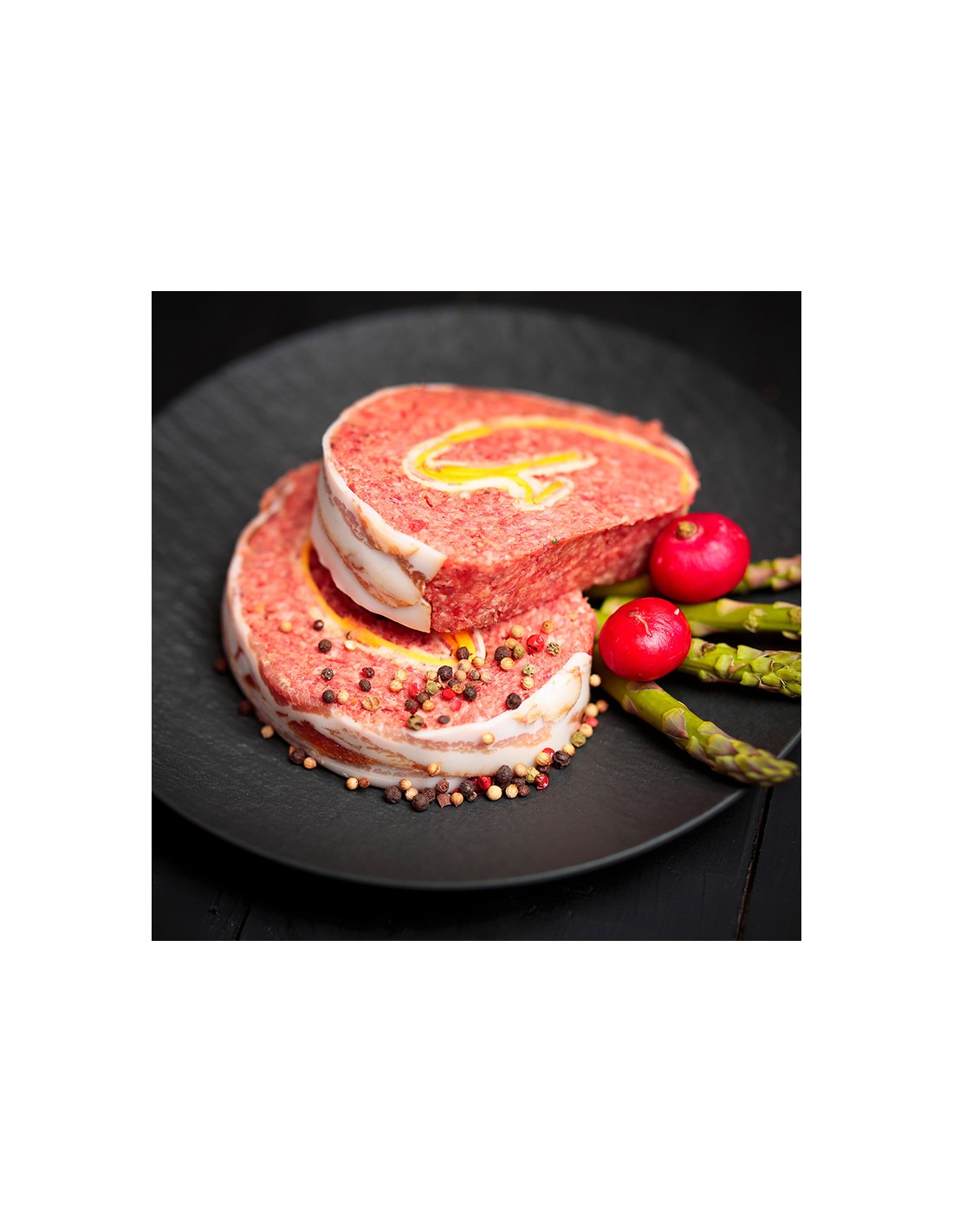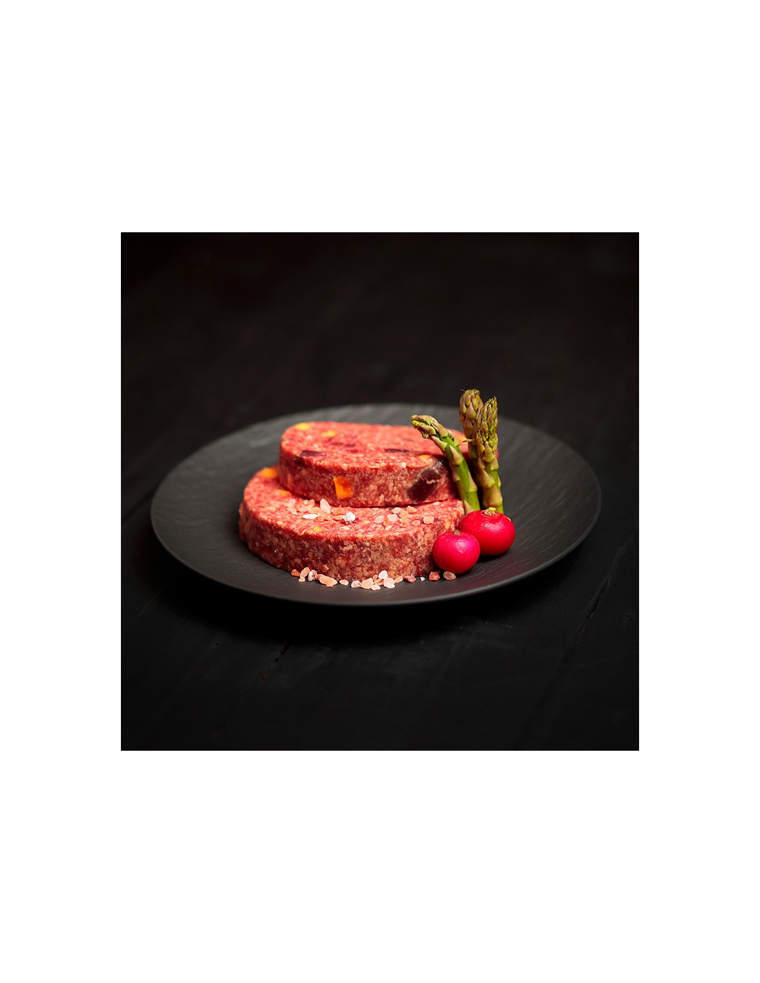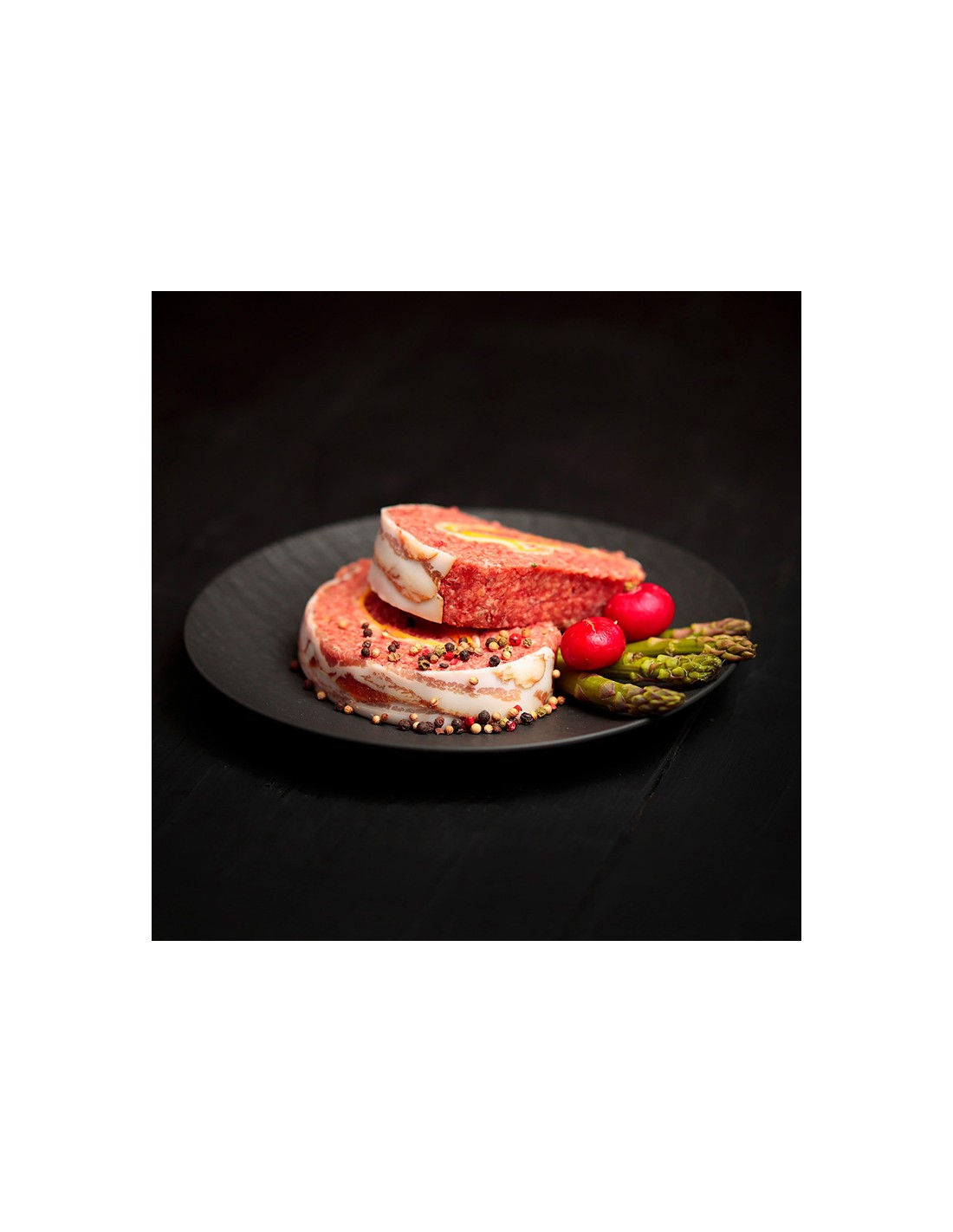 Lo elaboramos en porciones de 250 g con piezas magras seleccionas de buey y cerdo ibérico, mezcladas con taquitos de cecina de vacuno y queso para conseguir un excelente equilibrio de sabor, jugosidad y textura. Son completamente naturales y elaboradas con carne procedente de nuestra propia ganadería. Se prepara igual que una hamburguesa, a la plancha o parrilla. Te lo envasamos al vacío favoreciendo la adecuada conservación y cuidado de los pedidos, que preparamos diariamente en nuestra carnicería para garantizar la calidad y frescura de nuestra carne.