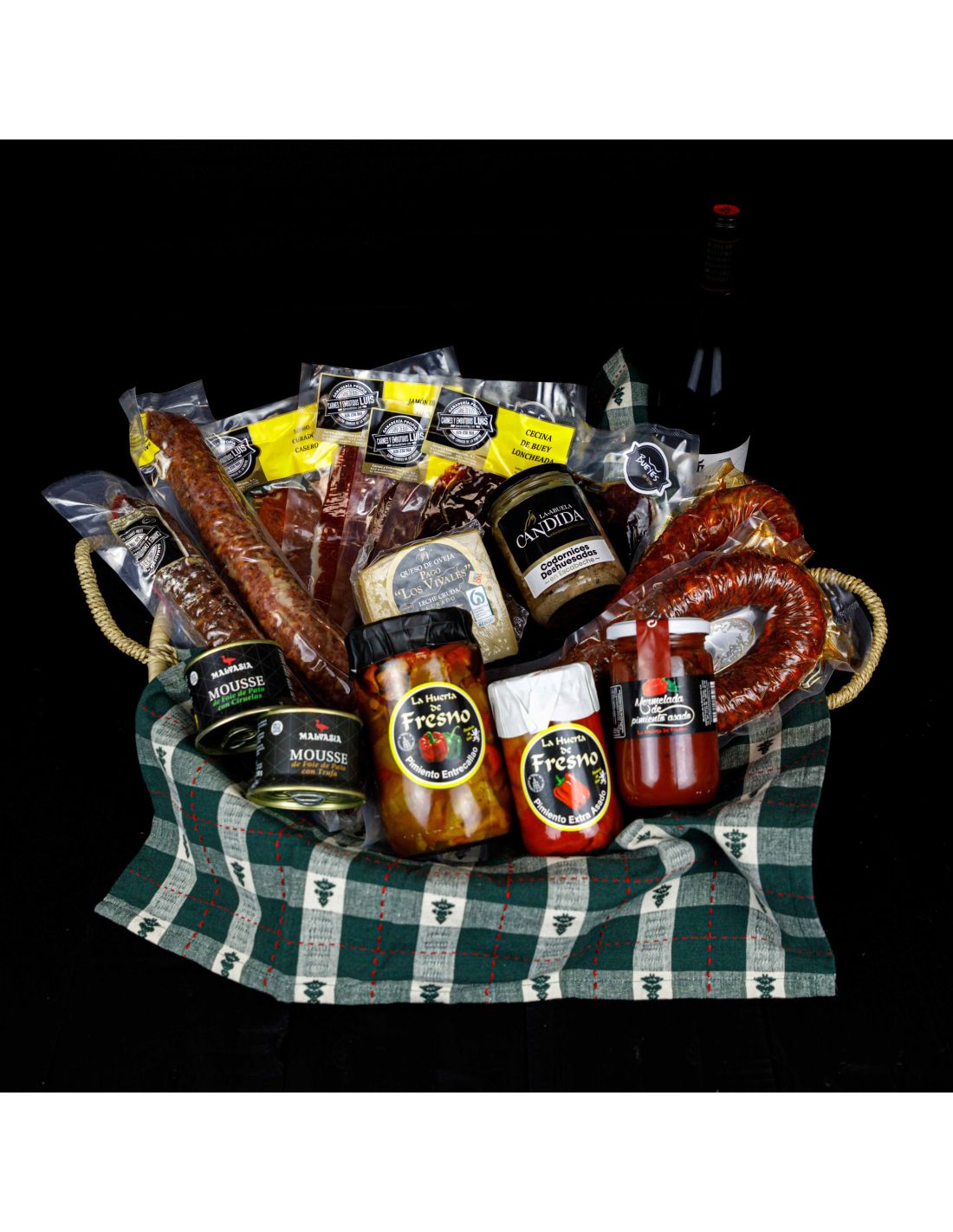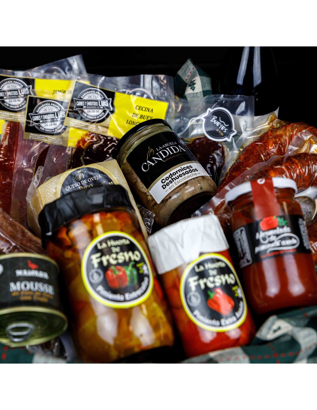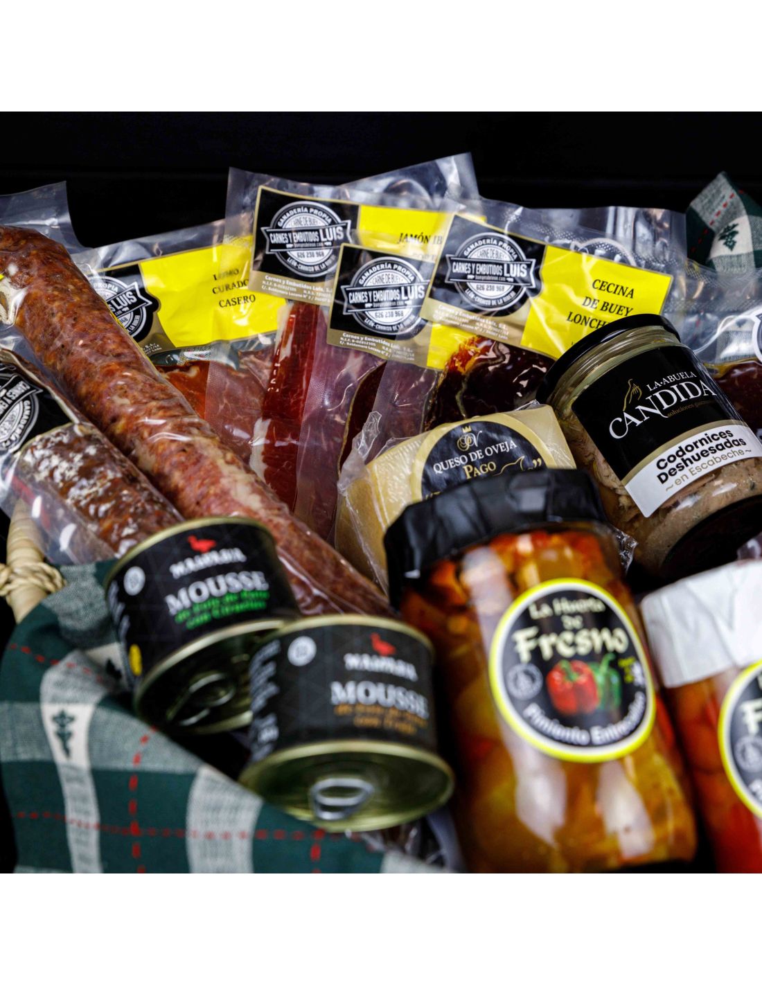 Cada lote está compuesto por una cuidada selección de embutidos de cerdo y buey. También incluye queso artesanal del Pago de los Vivales, conservas de La Huerta del Fresno, foie Malvasia, turrón gourmet y una botella de vino Cepas Viejas. Un auténtico reflejo de sabores gourmet en cada detalle.