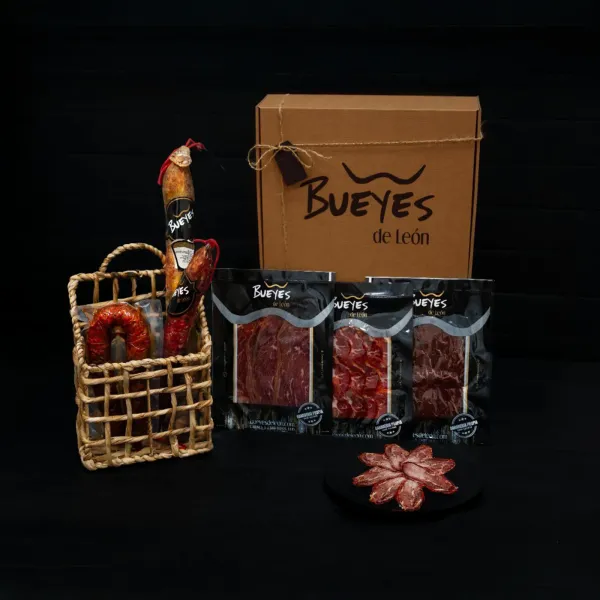 En este pack selección bueyes de león encontrarás una combinación perfecta entre embutidos de cerdo y buey, junto con una cuidada selección de curados loncheados listos para disfrutar. Incluye un chorizo de cerdo y un chorizo de buey (600-700 g cada uno), un salchichón de buey (600-700 g) y una variedad de loncheados envasados al vacío: cecina de buey, cecina de vaca, lomo curado y lengua de vaca curada (80 g cada uno).