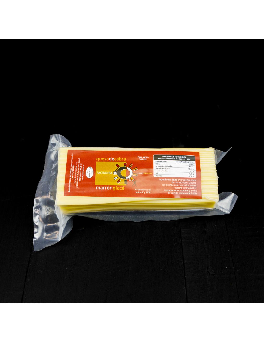 Ingredientes: Leche pasteurizada de cabra, Cuajo, Fermentos lácticos, Sal, Castaña confitada, Conservante (sorbato potásico- E-202)